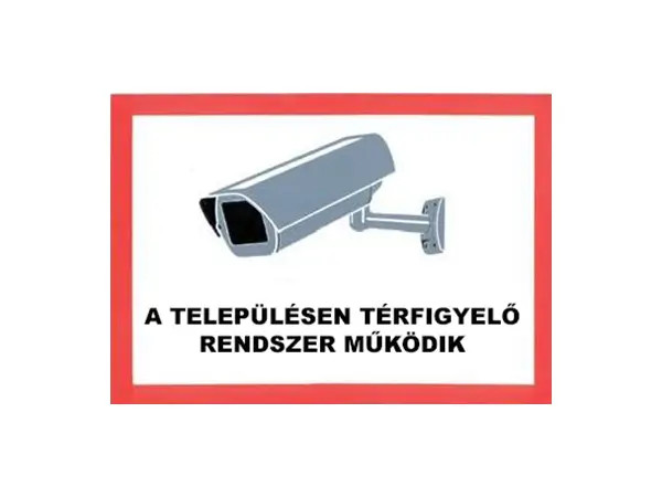 Warning sign, 1 mm plastic board, 210x300 mm, with the text "A TELEPÜLÉSEN TÉRFIGYELŐ RENDSZER MŰKÖDIK" and a camera housing graphic.