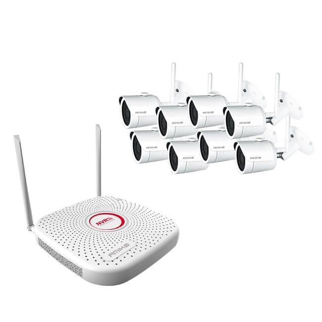 Wireless camera system kit with 8 pcs 2 MEGAPIXEL 1920 x 1080P Full HD WiFi cameras with 3.6 mm lenses and a 71° field of view, 8 x 12V 1A power adapters for the cameras, and 1 x NVR recorder for storing the camera footage. The storage hard disk drive (HDD) is not included and must be purchased separately.