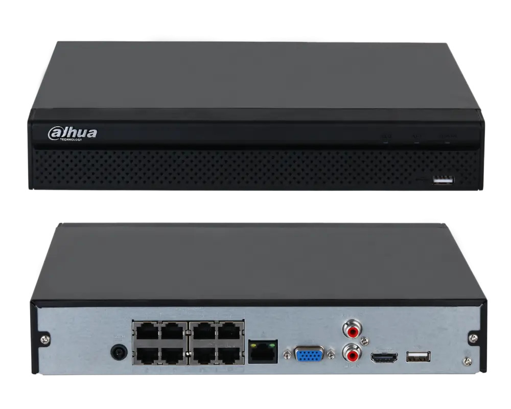 The Dahua NVR2108HS-8P-4KS3 is an 8-channel IP NVR recorder with 8 built-in PoE ports, allowing you to connect your IP cameras directly and power them without any extra steps or additional switch, significantly simplifying installation. It supports H.265+ video compression, which can reduce storage requirements by up to around 75% compared with older H.264-based recorders. It supports hard drives (HDD) up to 16 TB. HDMI and VGA outputs can be used simultaneously with up to 4K resolution, so you can connect both a TV and a monitor at the same time. Using the DMSS app, you can remotely view the images from the IP cameras connected to the recorder on your phone. The mobile app is also available in Hungarian.