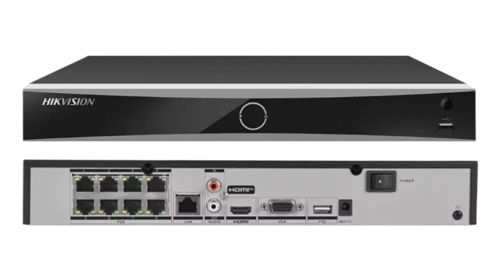 The Hikvision DS-7608NXI-K1/8P is an advanced AcuSense NVR IP recorder that can handle up to 8 IP cameras with a maximum 12 MP resolution. It supports H.265+ video compression, reducing storage requirements by up to 75% compared to older H.264-based recorders. It supports hard drives (HDD) up to 10 TB. The NVR offers 4K HDMI output, so you can view your IP camera images in 4K on a TV or monitor. It includes a wide range of smart features that improve surveillance efficiency and reduce the need for manual intervention. With AcuSense technology, the recorder provides advanced motion detection plus human/vehicle classification and analysis, helping to reduce false alarms. Face recognition features include face image comparison and face detection. Smart search makes it easy to quickly find video footage in a selected area, while smart playback improves playback efficiency. Using the Hik-Connect app, you can remotely view the cameras connected to the recorder from your phone. This NVR includes 8 PoE ports, allowing you to connect and power your security cameras directly from the recorder, without extra steps or a separate PoE switch. The NVR’s AcuSense functions are also available with limited capabilities when used with non-AcuSense cameras.