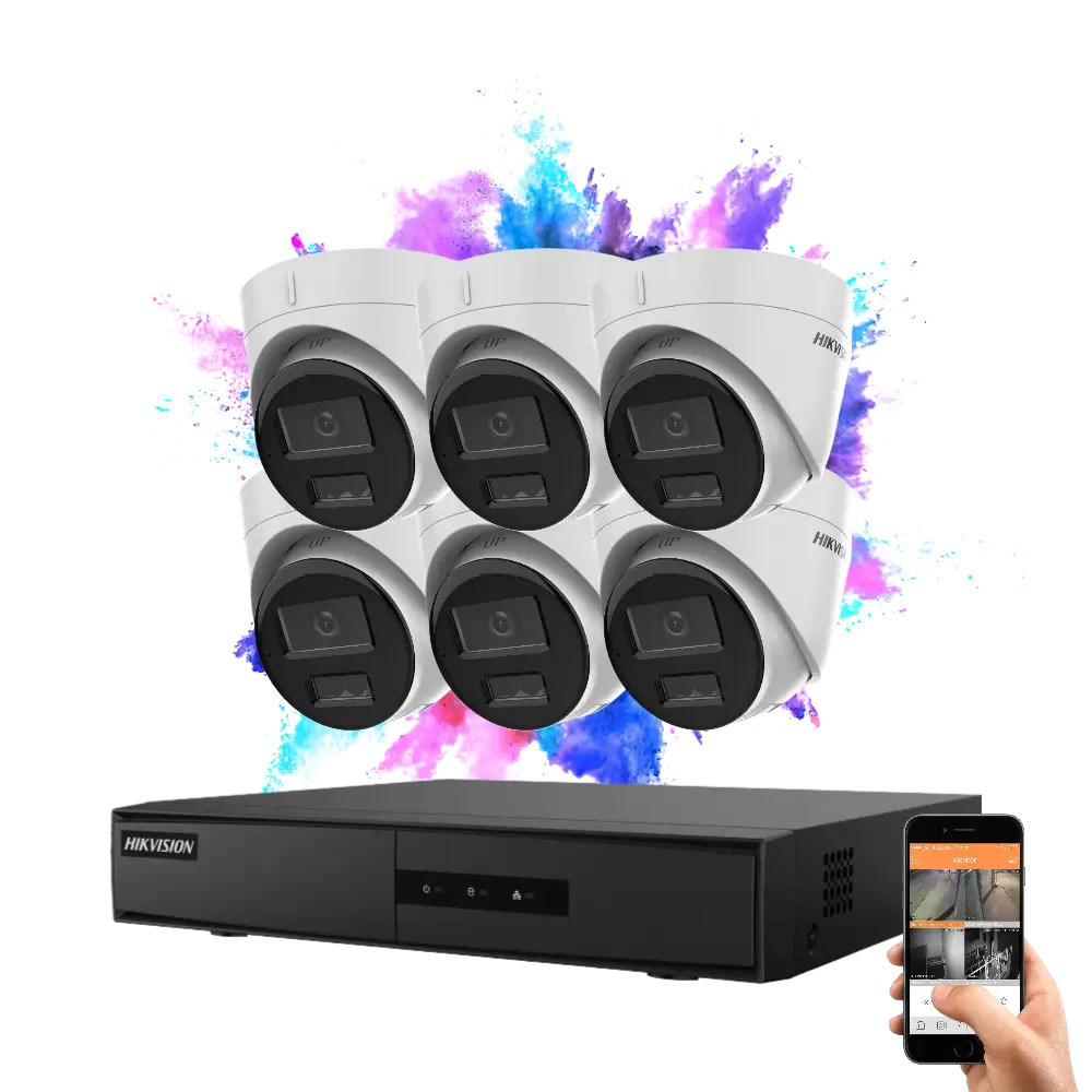 Hikvision IP camera system with 6 dome security cameras, 4MP color night vision and built‑in microphone