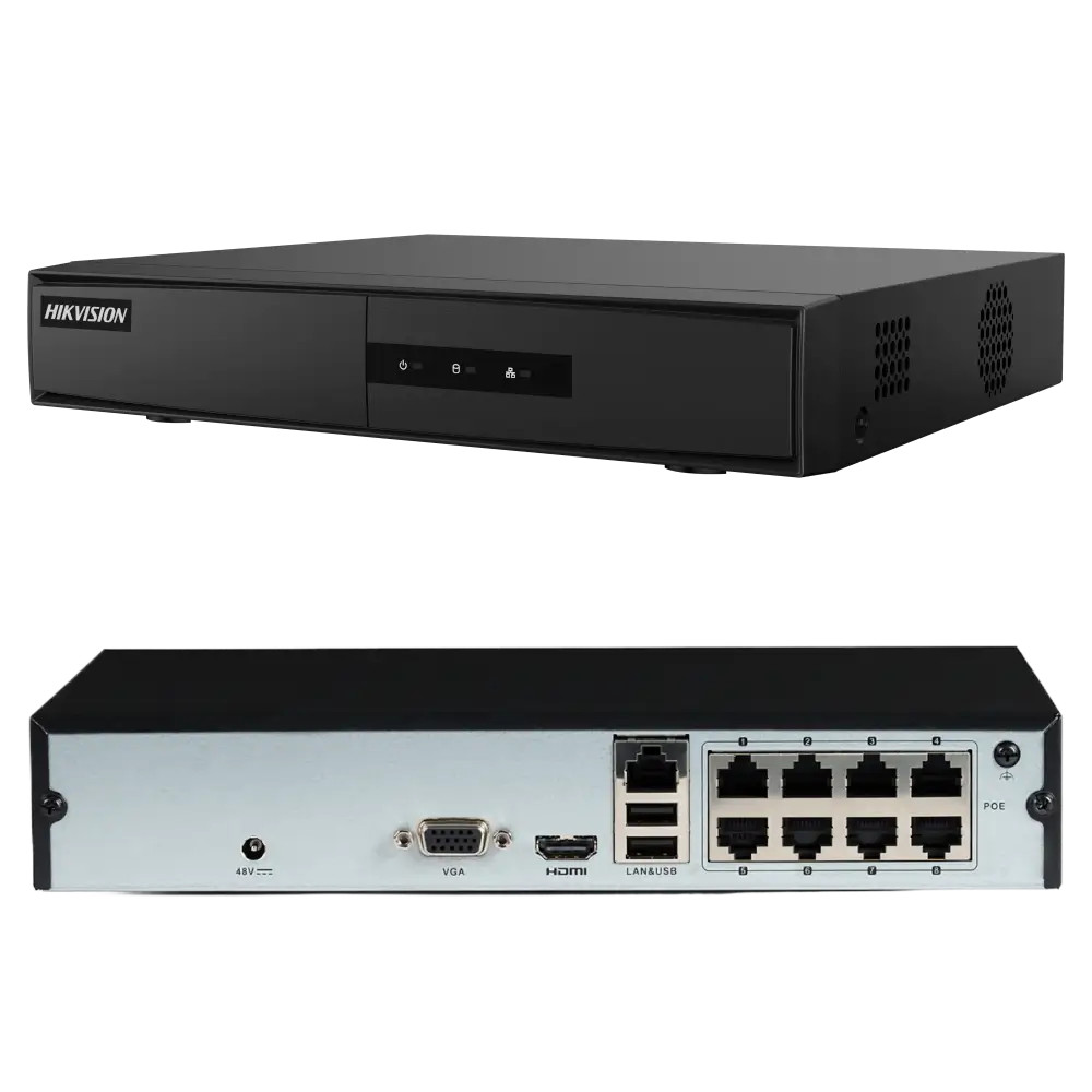 The Hikvision DS-7108NI-Q1/8P/M is an 8‑channel IP NVR that supports IP cameras up to 6 MP resolution. It supports H.265+ video compression, which can reduce storage requirements by up to 75% compared with older H.264‑based recorders. It can handle a hard drive (HDD) up to 6 TB. HDMI and VGA outputs can be used simultaneously with up to 1080p resolution, so you can connect both a TV and a monitor at the same time. Intelligent functions include line crossing and intrusion detection. Using the Hik-Connect app, you can view live and recorded footage from the connected IP cameras remotely on your phone. The NVR features 8 PoE ports, allowing you to connect and power your security cameras directly from the recorder without any additional steps or PoE switches.