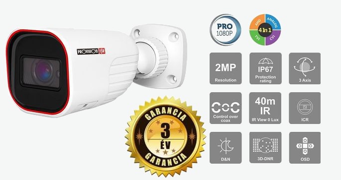 The Provision I4-320A-VF is an advanced security camera that provides an excellent solution for both indoor and outdoor use. This model is a 2 megapixel Full HD 1080p camera that delivers sharp, clear images even in low-light conditions. Its night vision range is 40 metres, making it a strong choice for medium distances. The built-in 2.8–12 mm adjustable lens offers a wide 90–33 degree field of view. The adjustable lens allows you to focus and zoom on a specific point in the monitored area. This varifocal security camera is a popular solution above cash registers and in front of entrances. Its IP67-rated water- and dust-resistant housing withstands harsh weather conditions, ensuring reliability and durability in a wide range of environments.