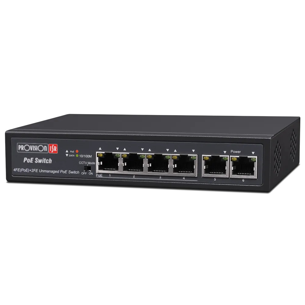 Provision 4+2 port PoE switch (PR-PoES-0460C+2I-V2) for IP camera systems. It provides a simple, reliable power and data solution for IP surveillance. The switch features 4 PoE ports and 2 up/downlink ports, allowing both data and power to be transmitted over a single UTP cable to each device. Thanks to its high performance, it can operate a connected IP camera from up to 250 meters away in CCTV mode.