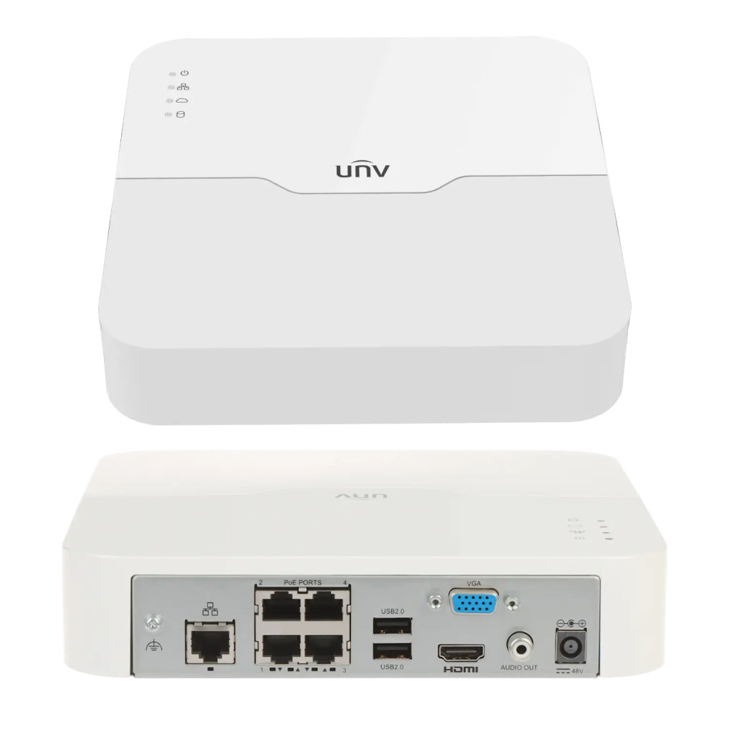 The Uniview NVR301-04LS3-P4 is a 4-channel NVR IP recorder that supports IP cameras up to 8 MP resolution. It has 4 built-in PoE ports, so there is no need for a separate PoE switch; the cameras receive power directly from the recorder. It supports H.265+ video compression, which can reduce storage requirements by up to 75% compared to older H.264 recorders. The unit supports HDDs up to 10 TB. A 4K HDMI output allows connection to the latest TVs and monitors. The recorder supports and manages cameras with face recognition, smart motion detection (UMD) and intrusion detection. Using the app, you can view the live and recorded images of the IP cameras connected to the NVR remotely from your phone. Both the on-screen menu and the mobile app are available in Hungarian.
